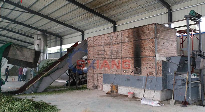 工作原理:由高溫煙道氣作為介質(zhì),進入滾筒干燥機,采用順流干燥工藝,在筒體下部設有四個小滾輪,支承并帶動滾筒干燥機旋轉(zhuǎn),由提升加料機把鮮葉輸送到加料口加入。濕料被熱空氣帶入旋轉(zhuǎn)的干燥機室內(nèi),物料在筒體內(nèi)的抄板和氣流作用下,不斷向前,由此濕料與熱空氣充分接觸,產(chǎn)生熱交換,從而提高熱效率和干燥強度,被干燥樹葉離開干燥機隨即進入氣流去石器,將雜質(zhì)除去,同時進入旋風分離器進行氣固分離,廢濕氣由風機抽出,干料經(jīng)關風器排出。